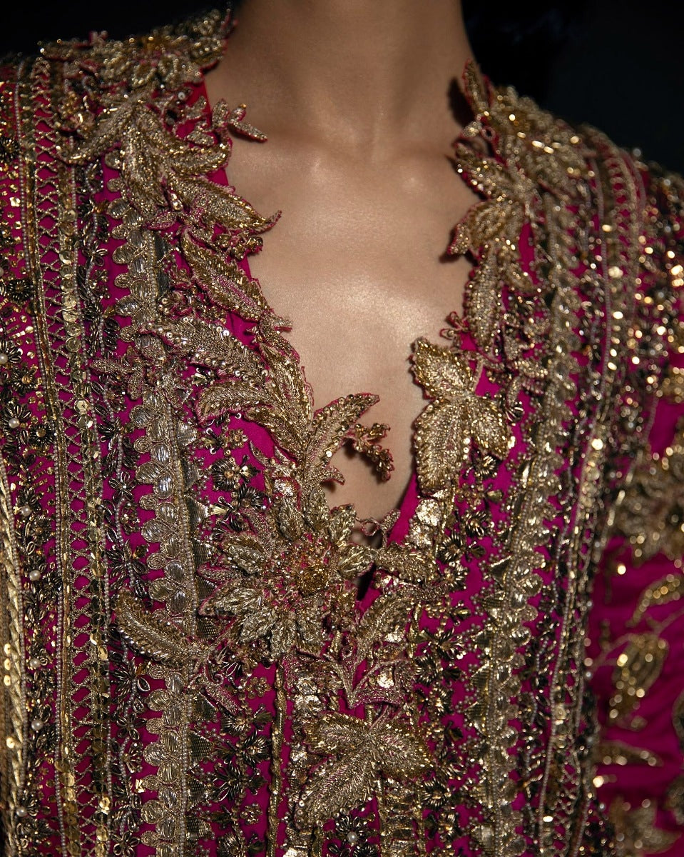 Illustrious details on a fuchsia silhouette reflecting a profound appreciation for timeless traditions.