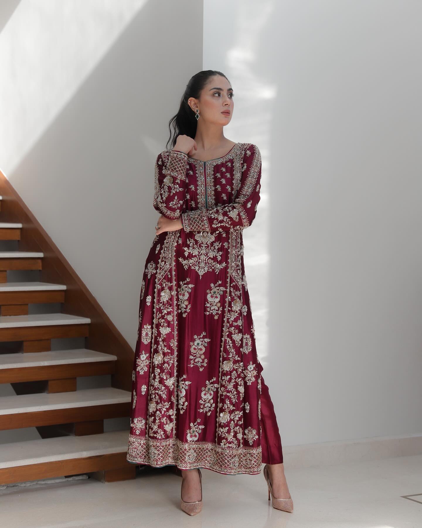 A deep maroon ensemble adorned with intricate silver thread work and delicate floral embroidery. The luxurious fabric flows gracefully, enhanced by detailed patterns that reflect classic Eastern craftsmanship. Flattering straight cut with full sleeves and a round neckline, this design strikes the perfect balance between traditional charm. The embellished borders and rich embroidery make it an ideal choice for festive occasions, weddings, or formal gatherings.